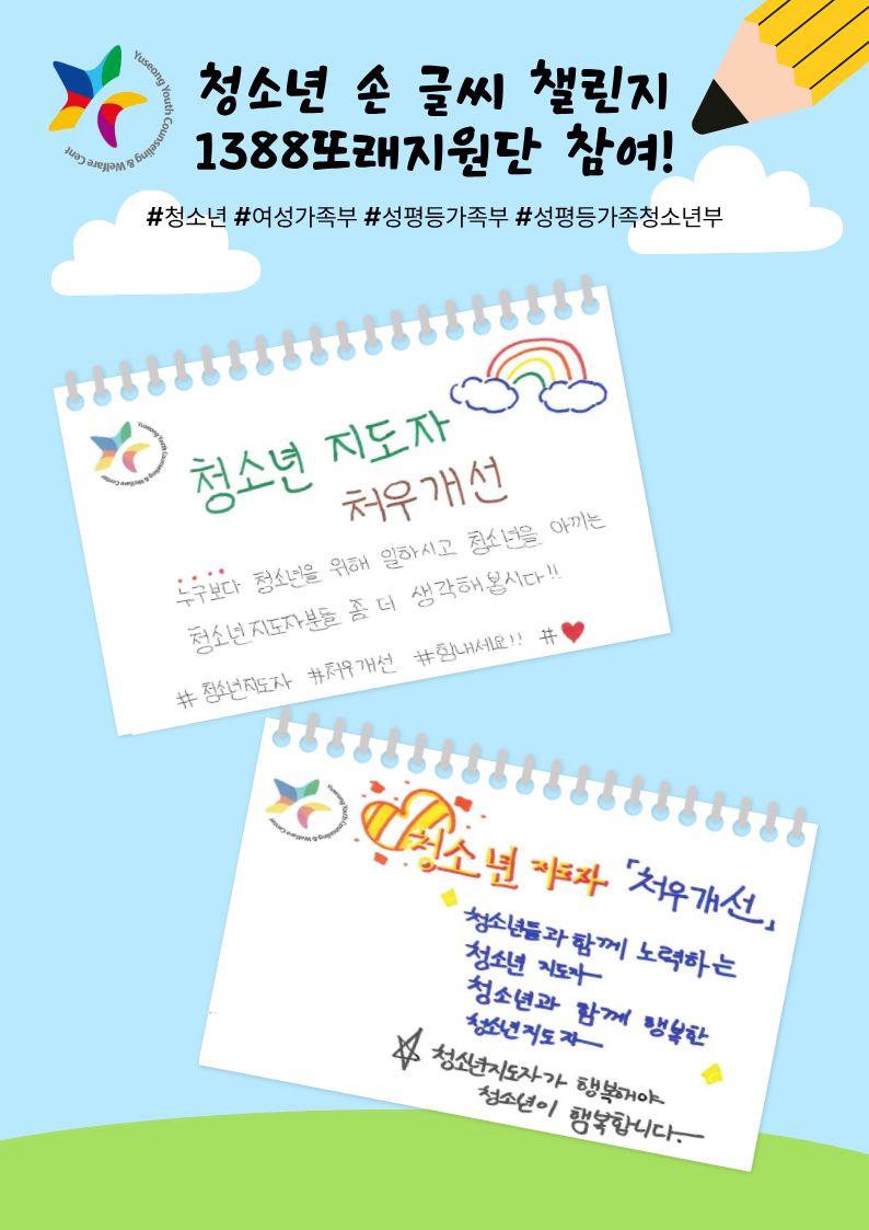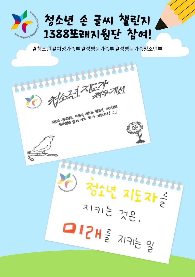 ์ ์ฑ๊ตฌ์ฒญ์๋ ์๋ด๋ณต์ง์ผํฐ์ ํ๋ํ๊ณ ์๋ 1388๋๋์ง์๋จ ๋จ์๋ค๋ ์ฒญ์๋ ์ ๊ธ์จ ์ฑ๋ฆฐ์ง์ ์ฐธ์ฌํด์ฃผ์์ต๋๋ค~