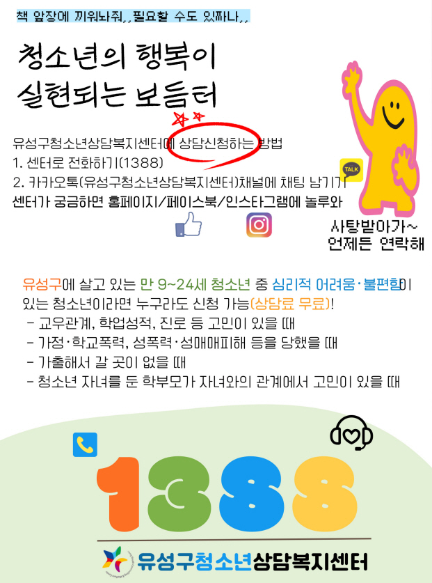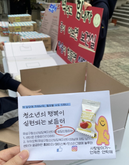 상담선생님과 보건선생님께서도 떡과 음료를 돌리시며 #유성구청소년상담복지센터 와 함께 생명존중을 주제로 캠페인을 열었습니다!! 반석고 학생들이 힘들 때 리플렛에 써있던 유성구청소년상담복지센터나 #청소년전화1388 번호가 떠올랐으면 좋겠습니다!