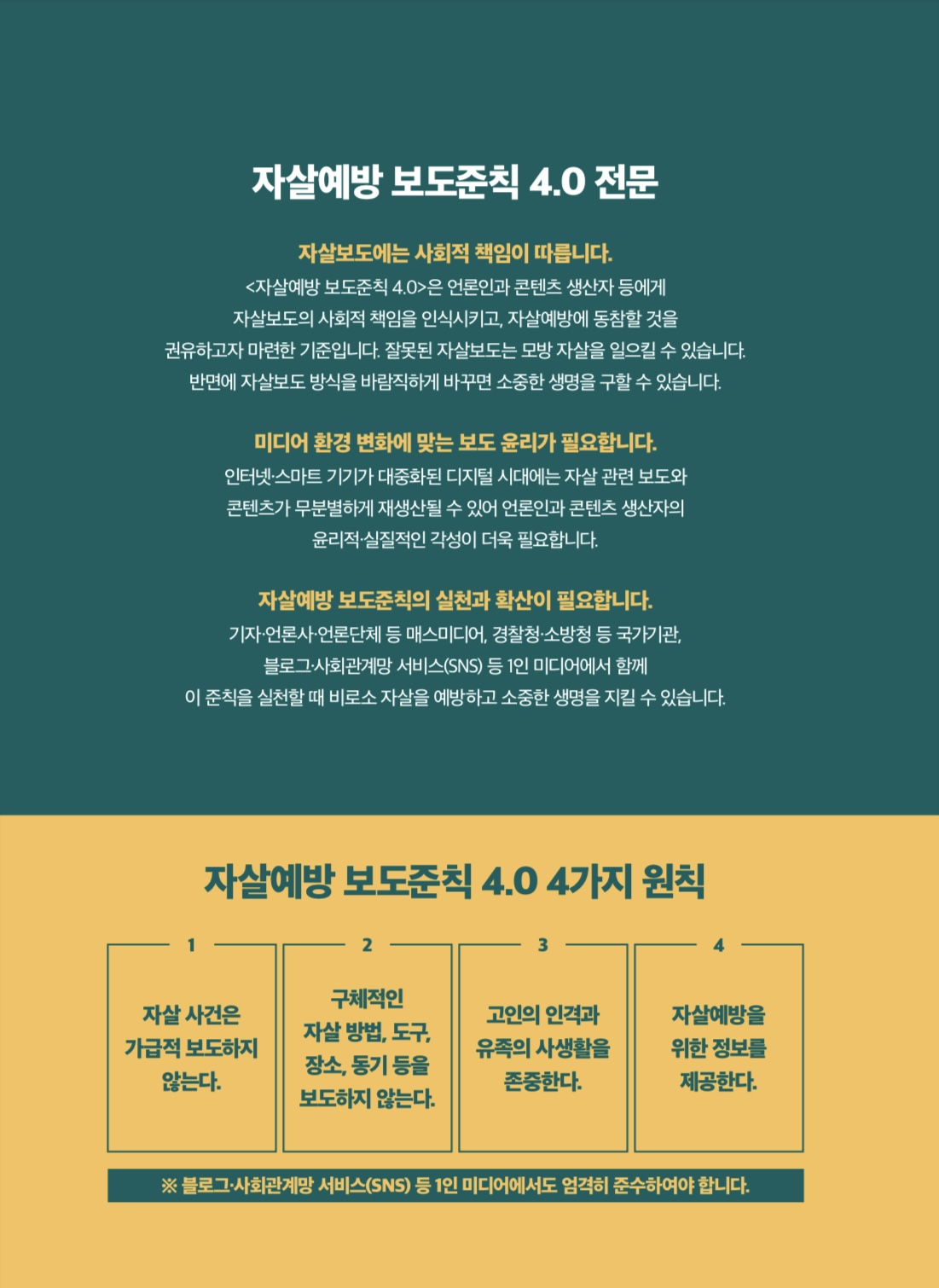 자살예방 보도준칙 4.0에서 나오는 4가지 원칙은 우리가 흔히 사용하는 블로그와 사회관계망 서비스(SNS) 등의 1인 미디어에서도 엄격히 준수해야 하는 사항입니다! 자세하게 읽어보고 싶으신 분들은 첨부된 파일을 다운로드 해보세요^^